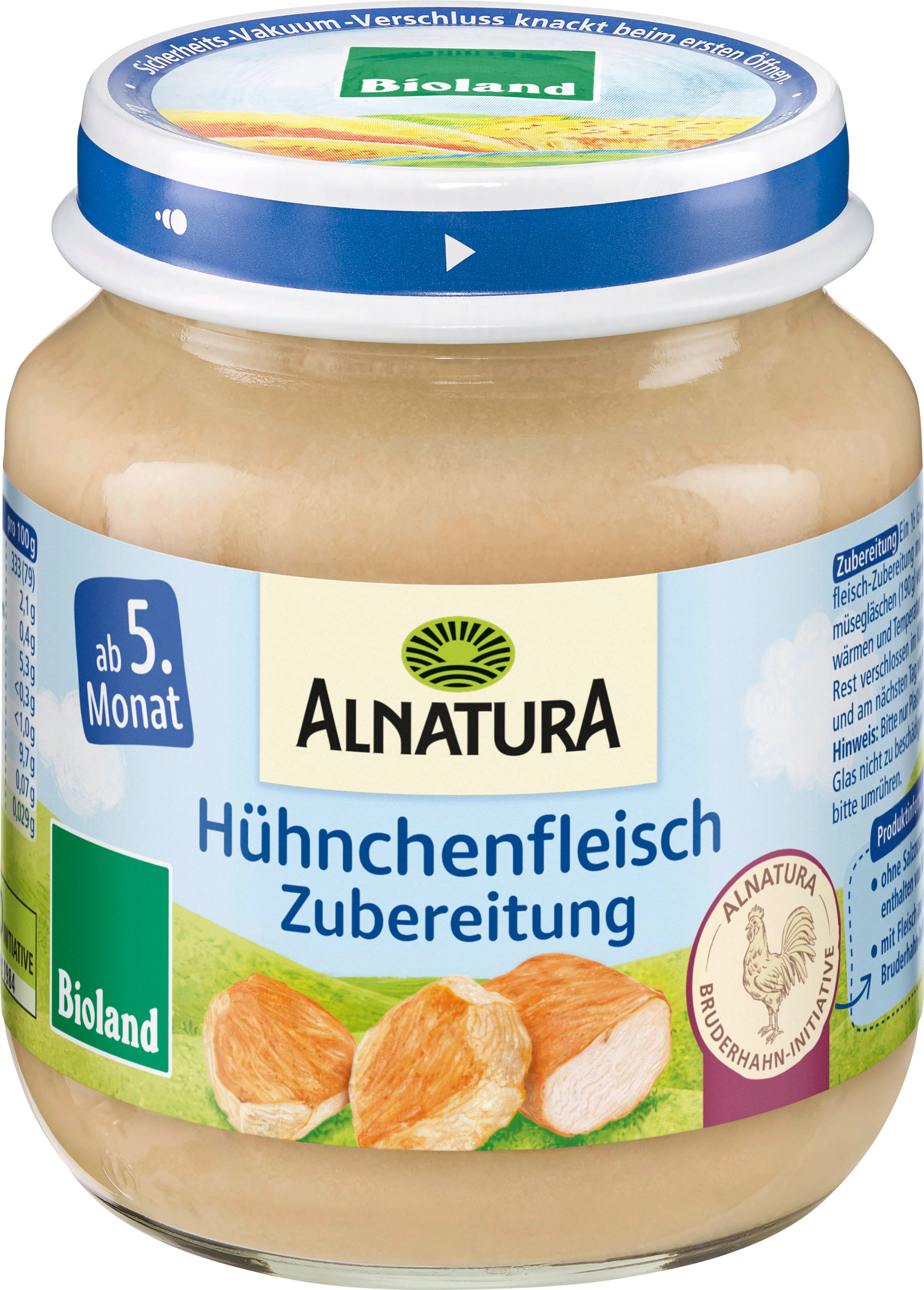 The gluten free baby jar Alnatura Bioland Chicken Preparation is finely puréed. It is produced without added salt (ingredients contain naturally occurring salt) and is lactose free. Ideally, mix half a jar with half a jar of vegetable purée and warm gently in a water bath.