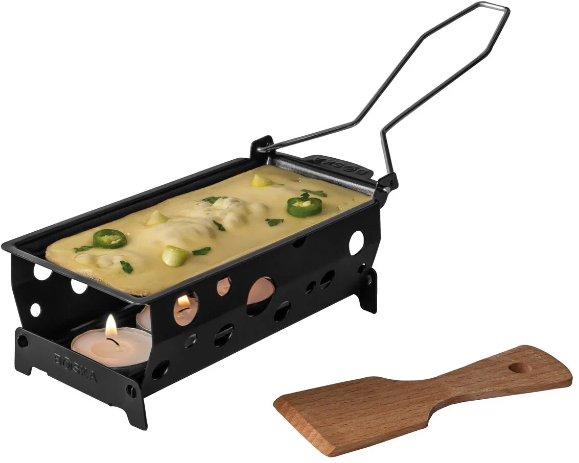 Want to enjoy melted cheese always and everywhere? This raclette set makes it possible. Just light the tealights, put the barbeclette over it, add cheese and four minutes later you can enjoy a delicious raclette.