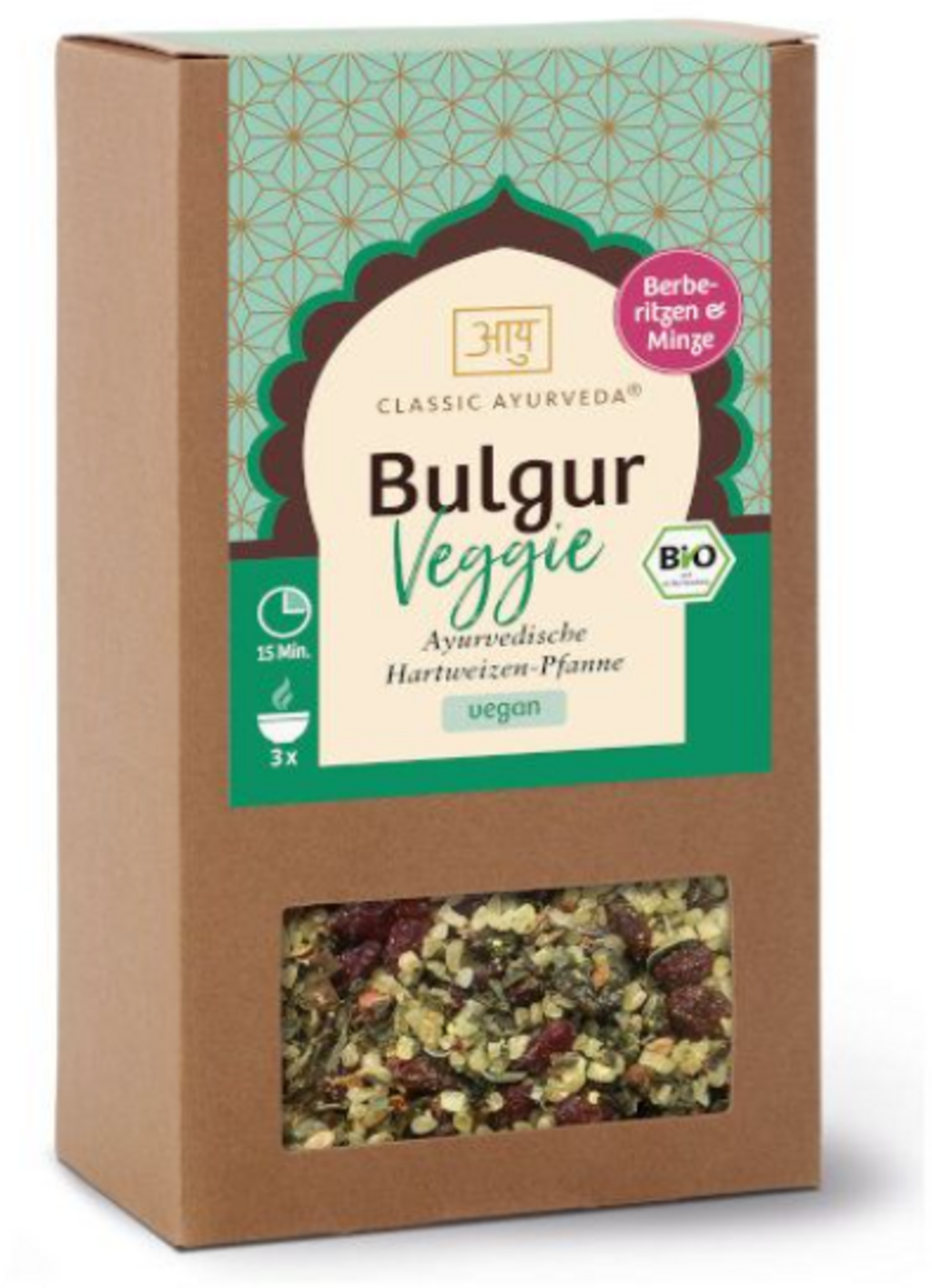 This organic Ayurvedic veggie bulgur mix is a great base for quickly prepared wholesome meals. The mix consists of gently steamed organic durum wheat combined with barberries, dates and sultanas. Peppermint, coconut flakes and a selection of spices such as cumin, turmeric and pippali give the dish an oriental note. It is suitable as a side dish for vegetable dishes, as a component in salads, stir-fries or patties.