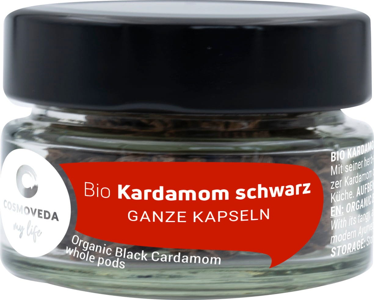 The black cardamom (Amomum subulatum), also known as Nepal cardamom or brown cardamom, is a plant that stems from the ginger family. Unlike green cardamom, black cardamom is rarely used for desserts. With its bitter flavour that is reminiscent of softwood and camphor, whereas the smoky flavour it owes to the traditional drying done over an open fire. It is often used as a spice in savory meat dishes. In contrast to the green cardamom, considered the "cooling" spice, black cardamom is a "warming" spice. It is therefore main ingredient of garam masala alongside cloves, cinnamon and black pepper .