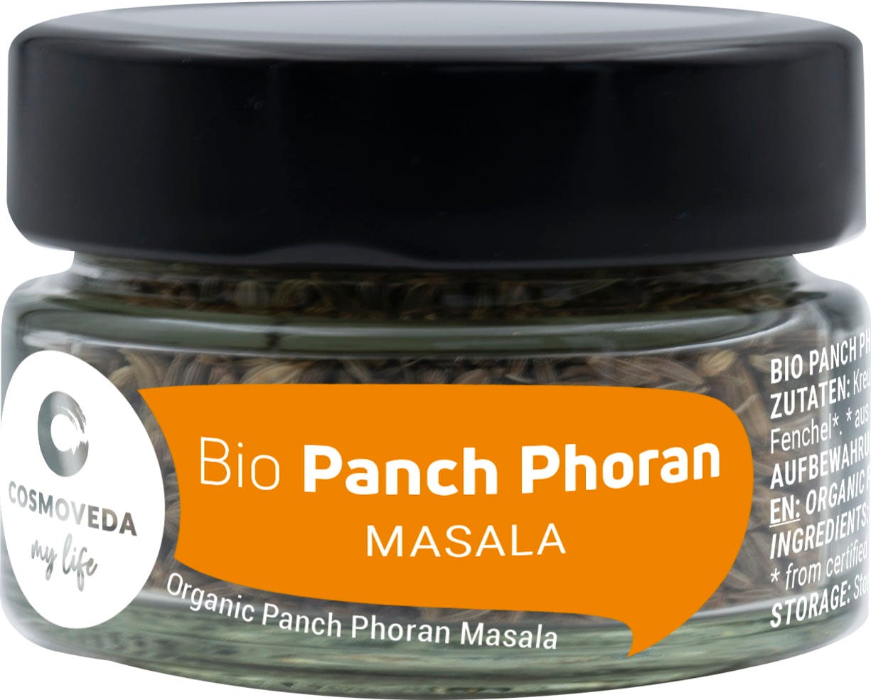 COSMOVEDA ORGANIC Punch Phoran, a specially formulated Ayurvedic mixture of whole spices, which are roasted in ghee at the beginning of cooking process to promote digestion and to support the authentic taste of Indian and ayurvedic dishes.