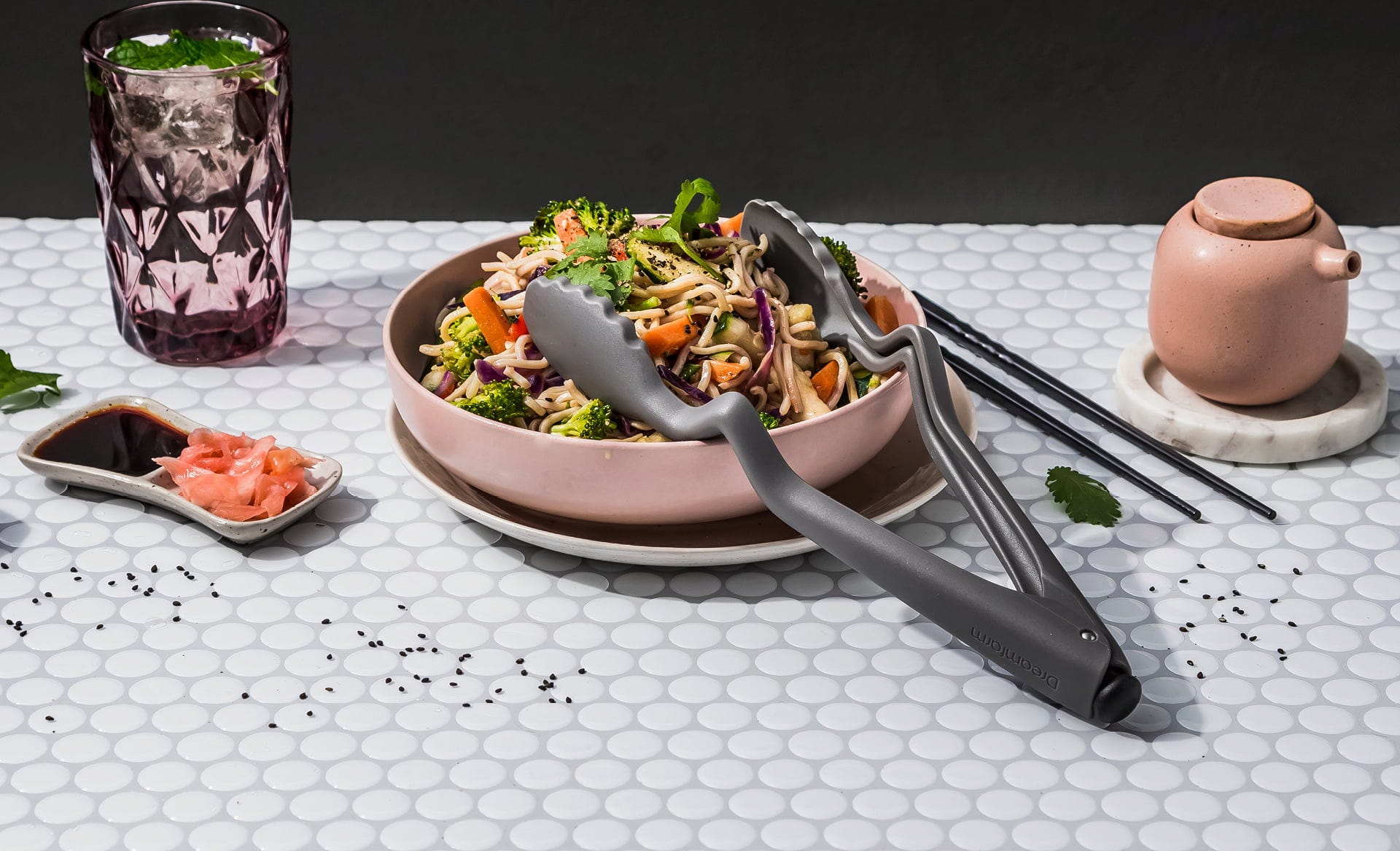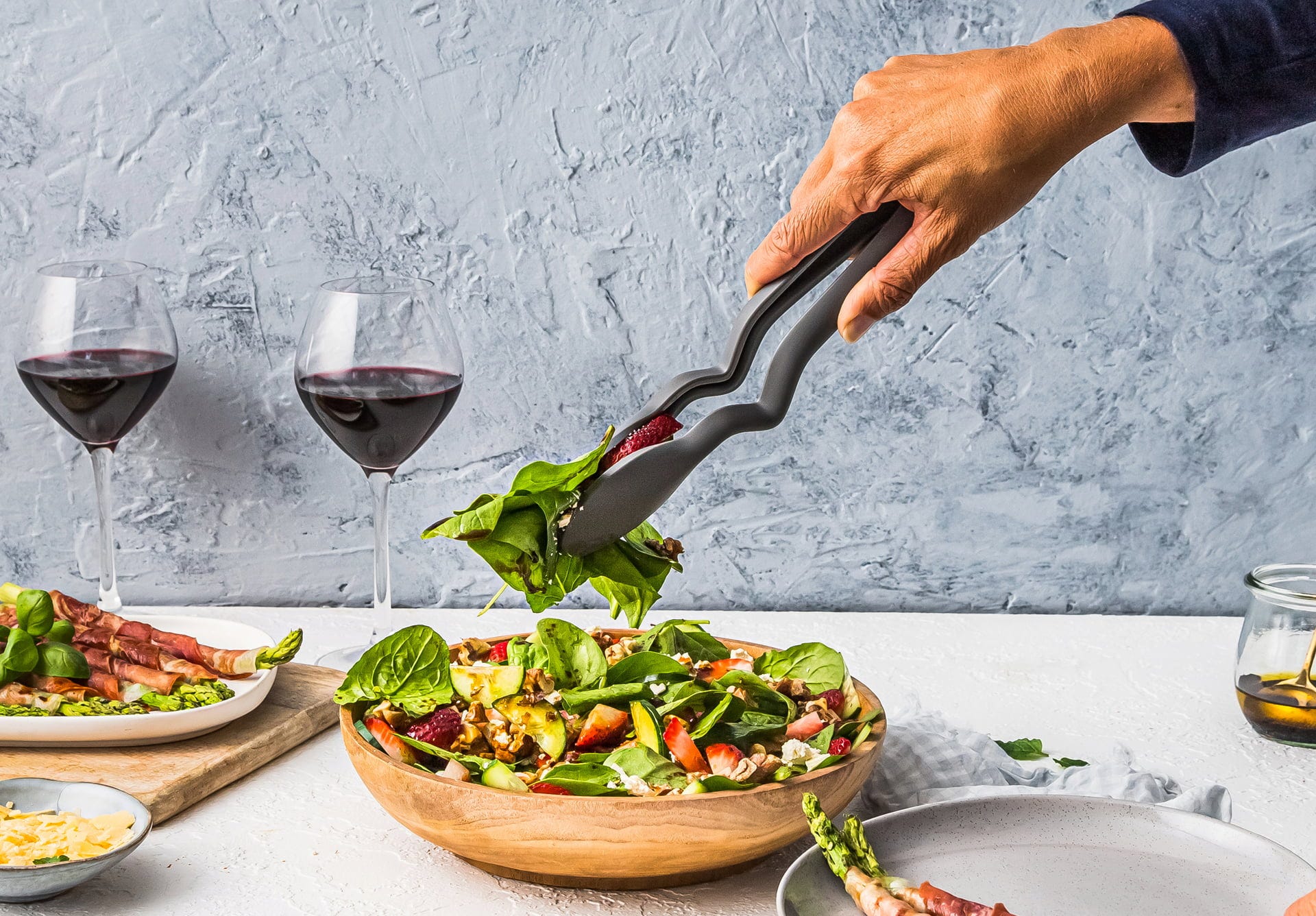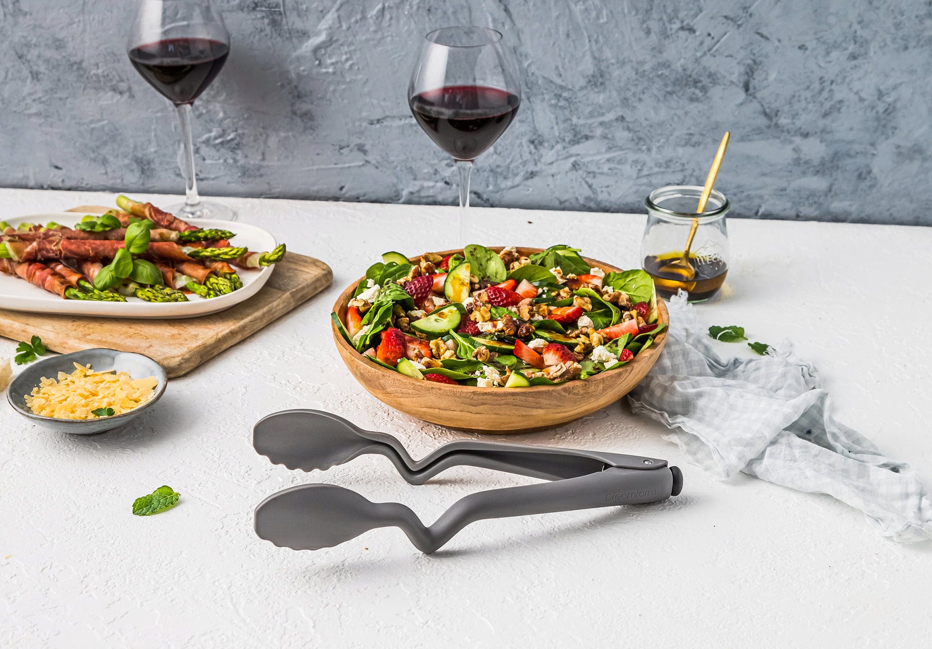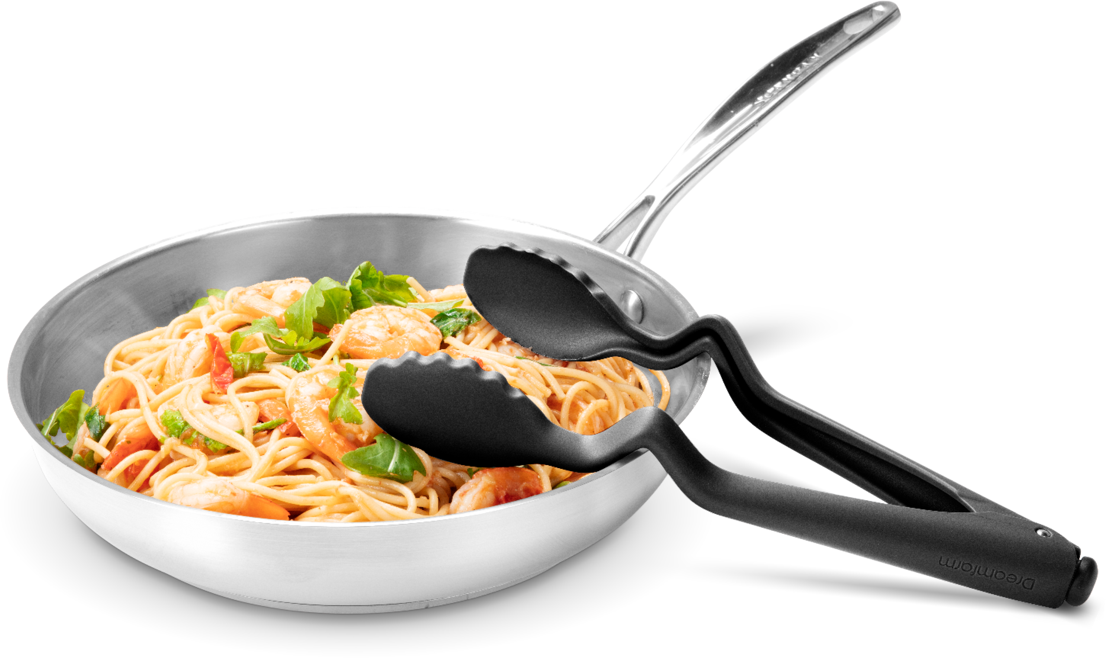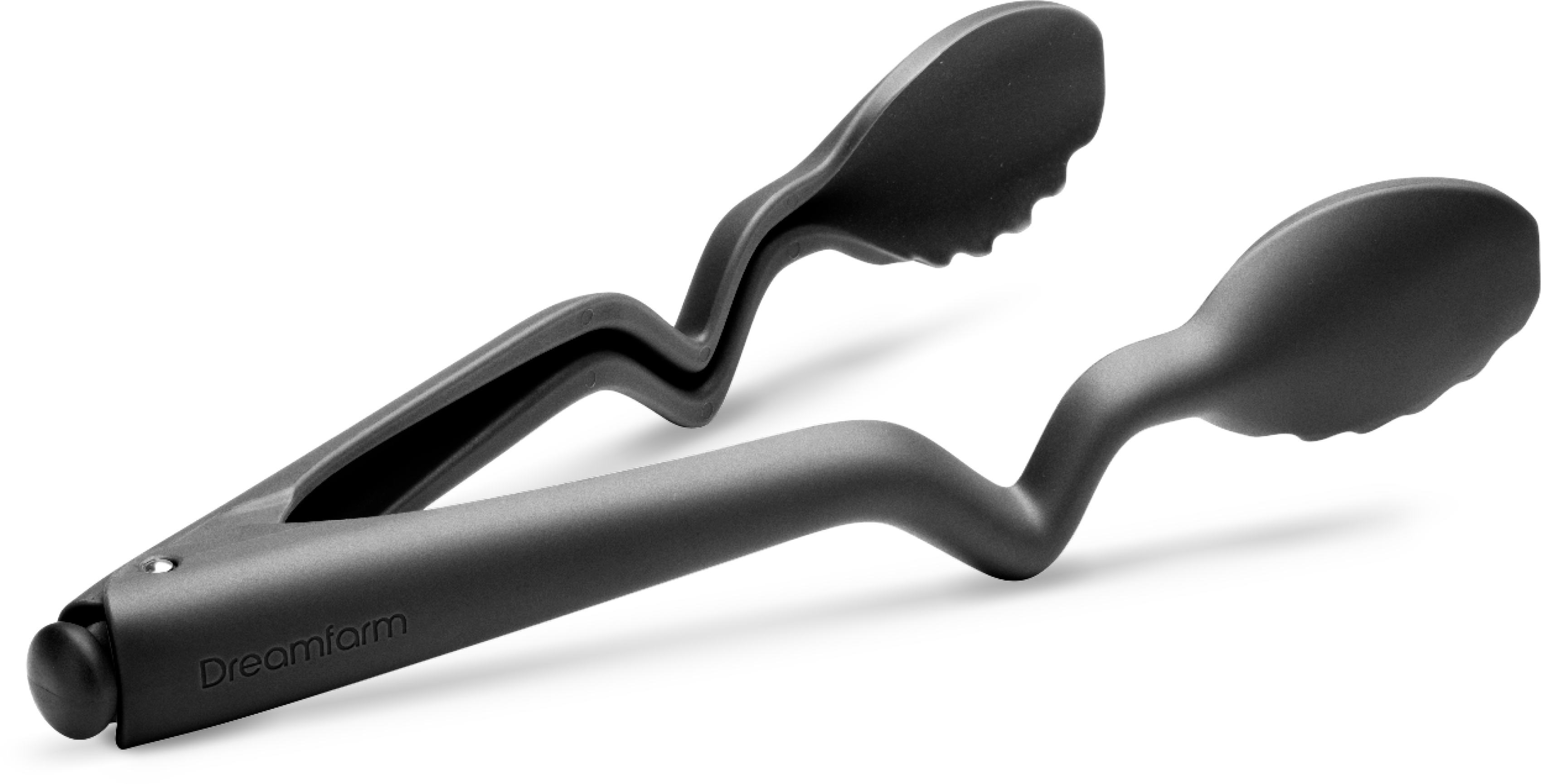 Keep your kitchen counters spotless while you cook. Thanks to the innovative "sit up" bend in the handle, the heads of the Clongs Lite by Dreamfarm stay elevated above your work surface or can be securely hooked directly onto the rim of your pot! With the practical click-lock mechanism at the end of the handle, you can conveniently open and lock the tongs with one hand at the push of a button.