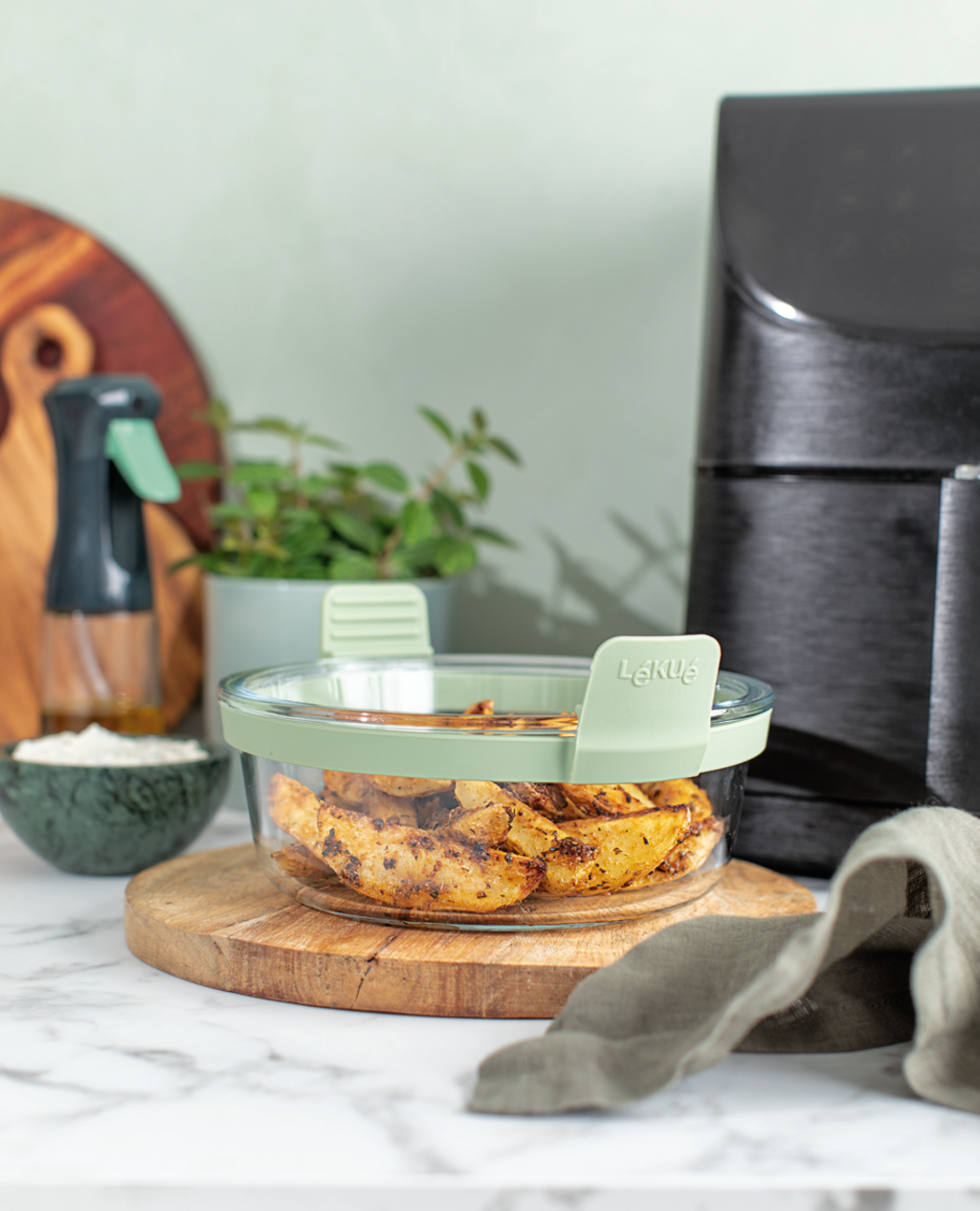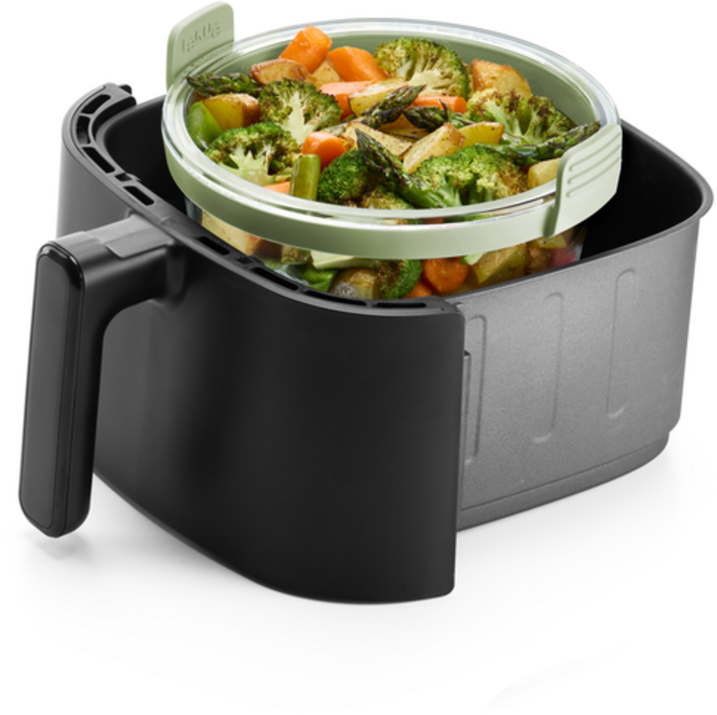 This clever all-rounder made of robust borosilicate glass is not only perfect for gentle preparation in the hot air fryer, but can also be used in the oven or microwave. Thanks to its minimalist design with removable handles, it can be used to serve food directly at the table.