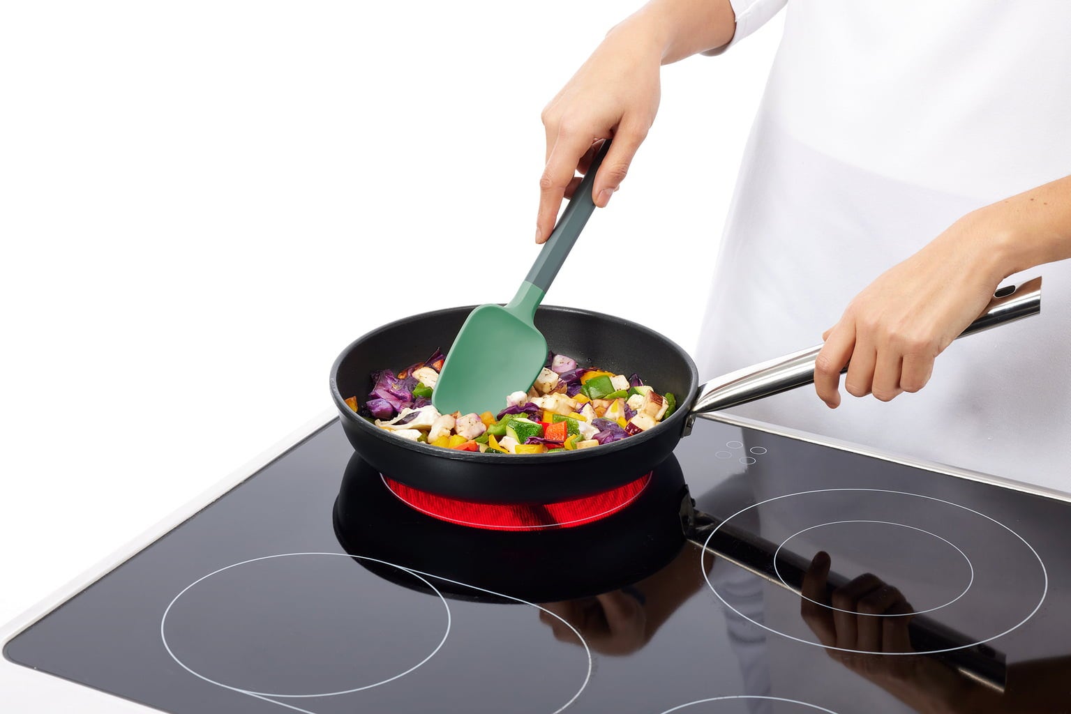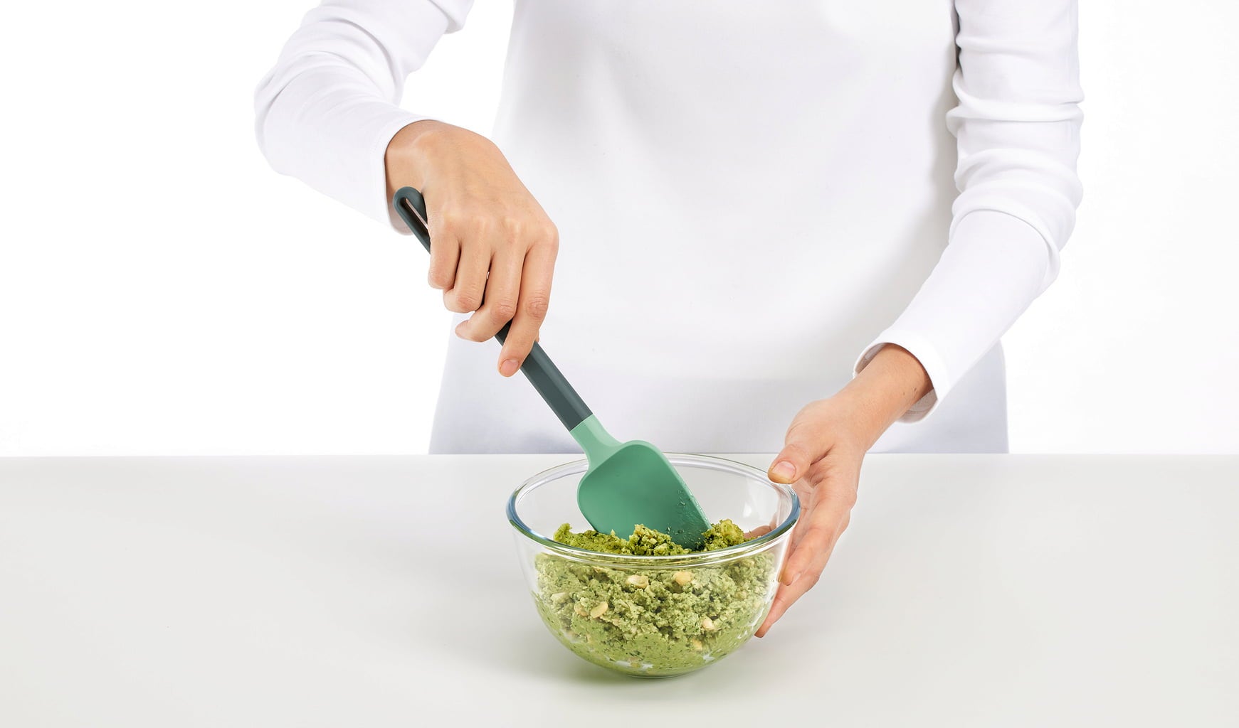 Its flexible tip, made from high-quality 100% platinum silicone, is heat-resistant up to 220 °C – perfect for stirring hot foods in a pot or pan. It also protects sensitive cookware surfaces and allows you to scrape bowls clean with ease, thus reducing food waste.
