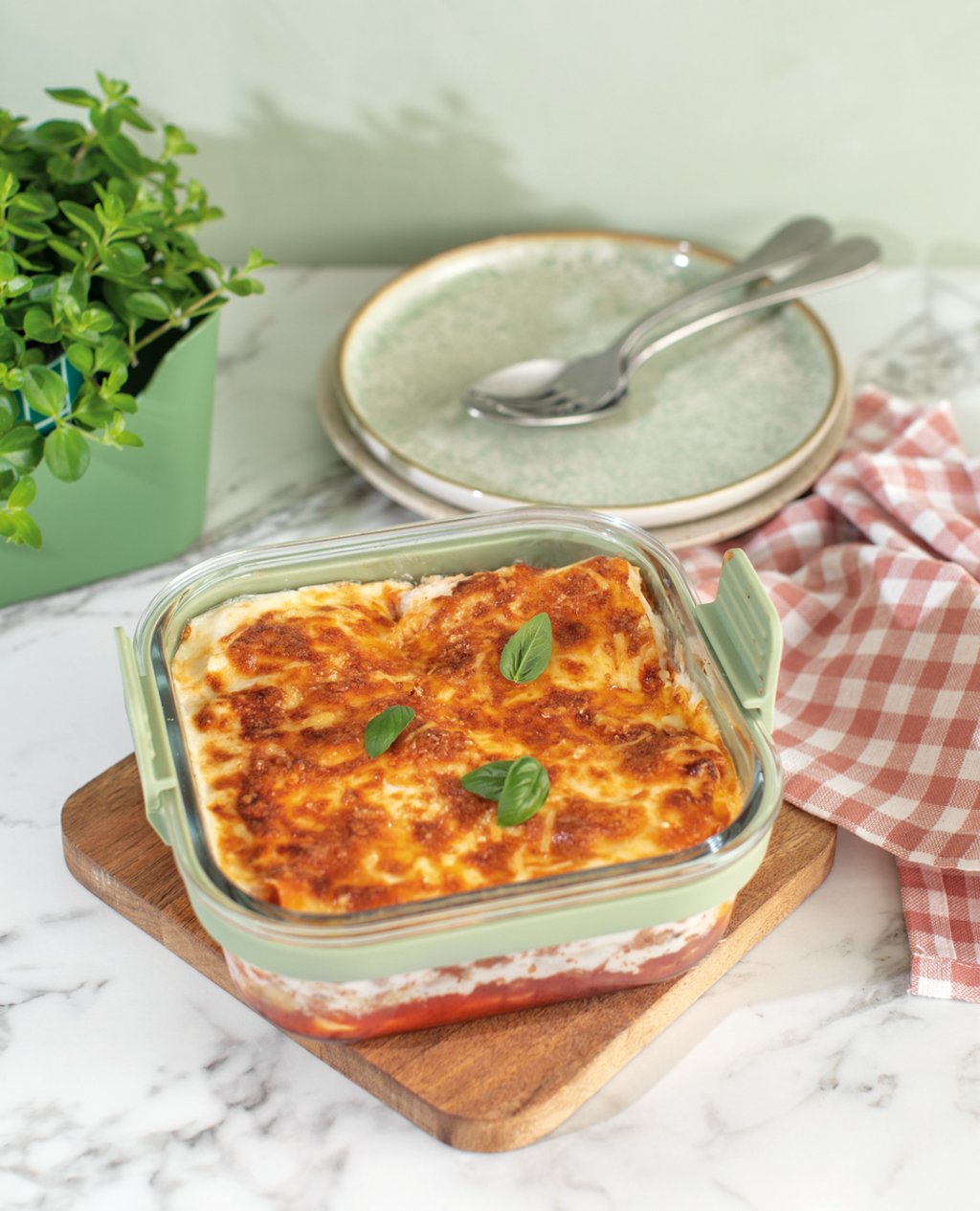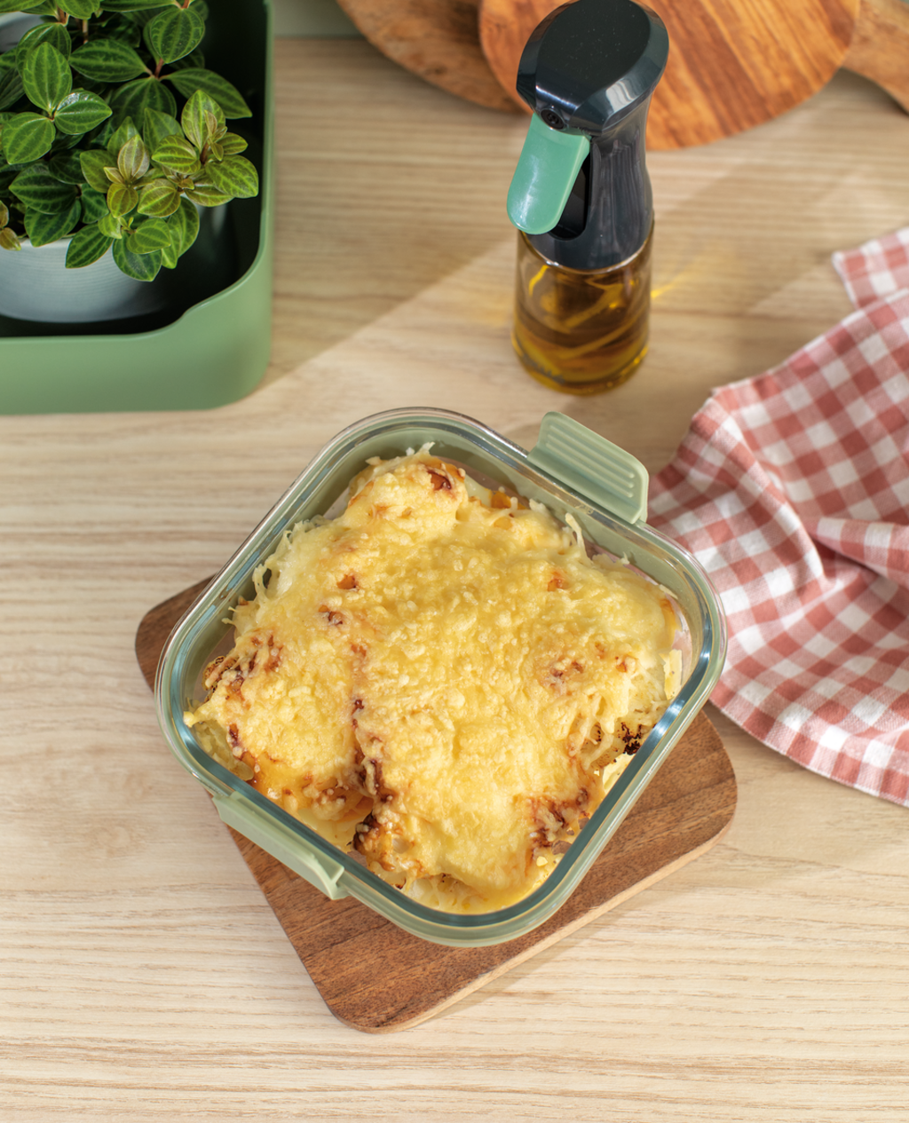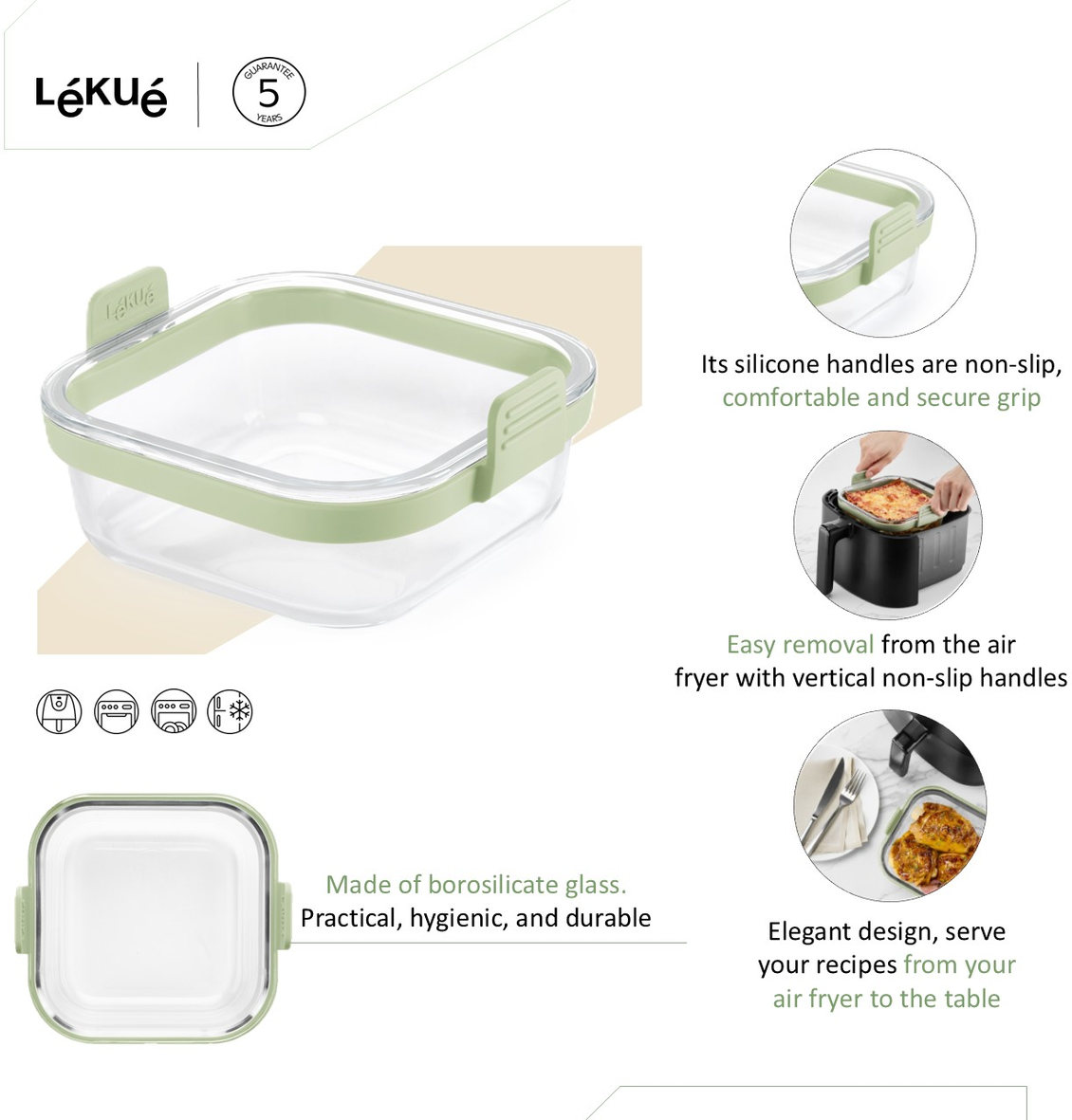 This clever all-rounder made of robust borosilicate glass is not only perfect for gentle preparation in the air fryer, but can of course also be used in the oven or microwave. Thanks to its minimalistic design with removable handles, it can also be used to serve food directly at the table.