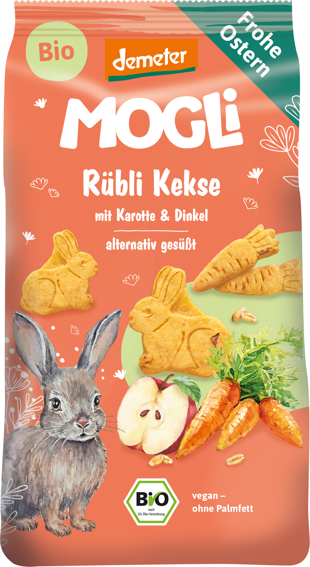 Moist spelt biscuits with carrots and apples in adorable shapes of rabbits and carrots. Your little ones will not only love the cute shapes but also the delicious sweet taste thanks to agave syrup. Perfect for a snack during a break, between meals or while on the go. Contains no added aromas.