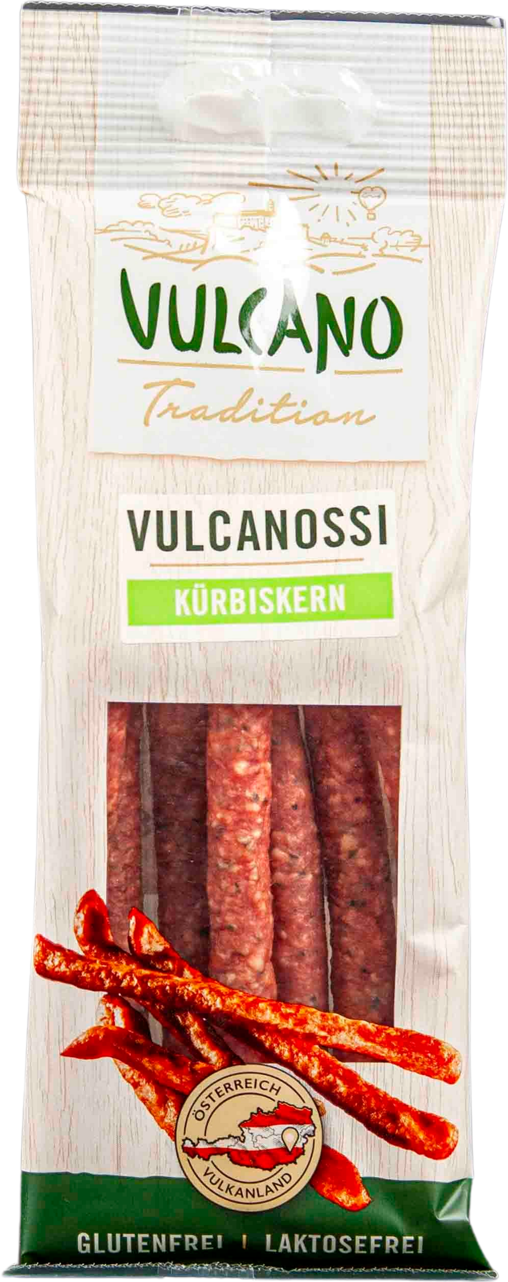 Vulcanossi sausages with pumpkin seeds are made from high-quality pork, fine spices and Styrian pumpkin seeds. Lightly smoked, they have a unique flavour and aroma. Perfect as a snack, with raclette or with appetisers - crunchy and irresistibly delicious!
